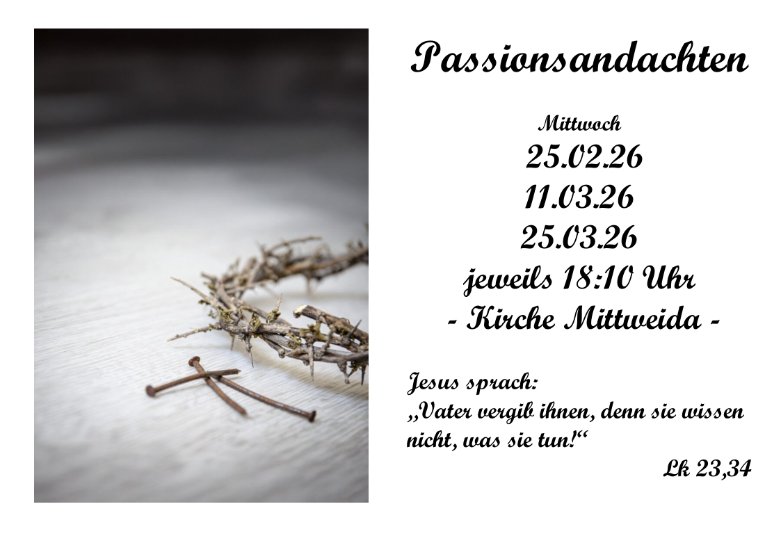Wir laden am 24.12.2025, 15:00 Uhr zum Krippenspiel in die Stadtkirche Mittweida ein.15:00 Uhr und 17:00 Uhr findet in der […]